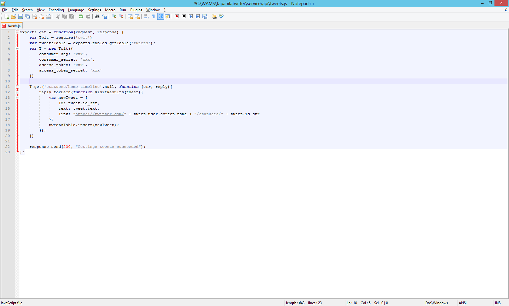 - Test your site out by browsing http://tapanilatwitter.azure-mobile.net/api/tweets