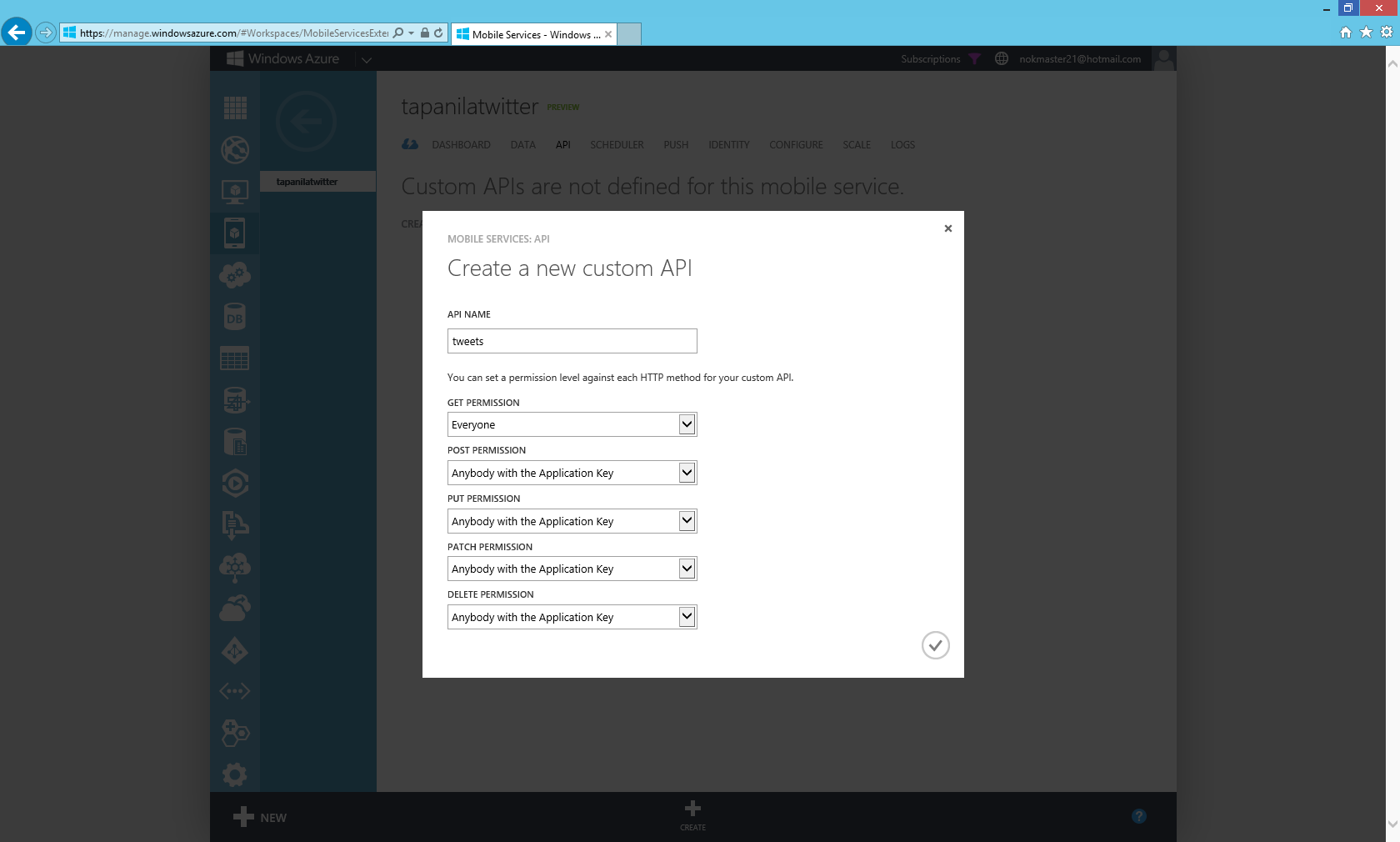 - Create new API and call it "tweets". Make sure that you put GET permission as everyone to make testing a lot easier.